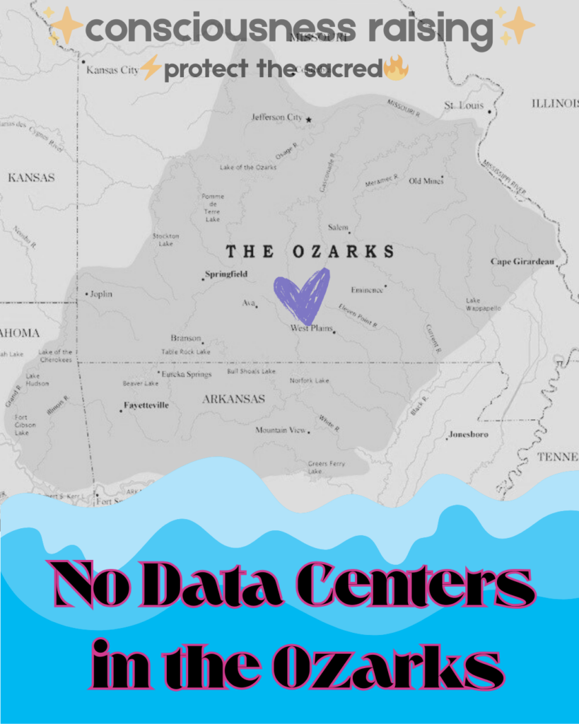 Nationwide Big Tech and AI companies are making local contracts, often under pseudonyms, to develop data centers. At times the local public isn’t even aware until it’s too late. These data centers are not only initially non-consensual in relationship with local human populations, but they will also have a draining long term rippling impact with local ecosystems, water tables, constituent’s power bills and more. Because of this long term impact, we must preemptively educate ourselves and spread the word to our communities to make sure that data centers don’t take root. This page is dedicated as a community resource and consciousness raising effort for folks who desire to keep the Ozarks data center free! Luckily others have already started developing tool kits unto these efforts. I recommend the North Star Data Center Policy Toolkit if you would like to educate yourself further on these themes. The folks at honorearth.org have also compiled a list of resources tracking data center news and education. Please check out both resources.