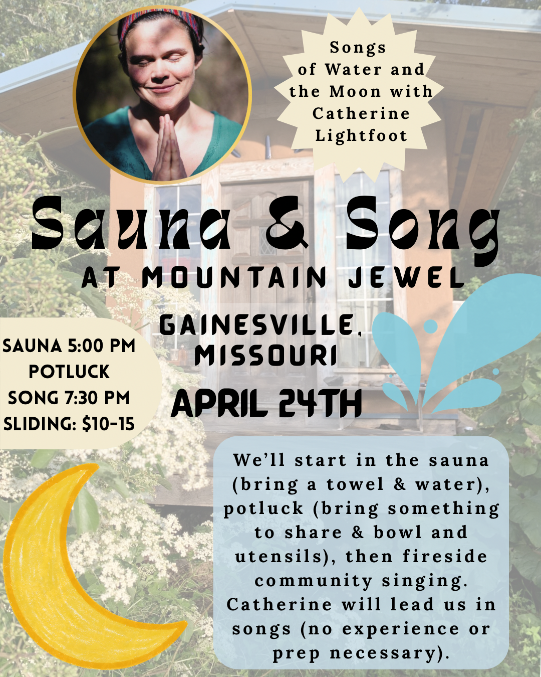 We’ll start the song circle around 7:30. It’s okay if you can’t make it for the sauna and just want to come for the song circle. Just let us know!